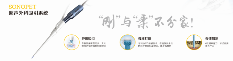 Sonopet超声外科吸引系统是史赛克为神经外科、骨科等研发的超声刀,具有“软硬兼施、刚柔并济“的特点,拥有3种直型、带角度手柄,11种超声刀头,8种软组织超声刀头,帮助医生在解剖结构复杂区域实现精细化软组织去除、骨性切割、骨性打磨等,有效提高手术效率,缩短手术时间,提高手术效果。
