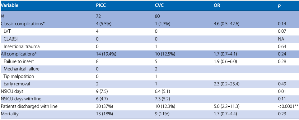 结果显示,PICC组72例患者中,大静脉血栓形成、与中心静脉导管相关血流感染和机械性创伤的总发生率为4/72,CVC组80例患者的上述并发症总发生率为1/80,两组的风险大小相近(OR=4.6;95% CI,0.5–42.6;p=0.14)。所有并发症的发生率,PICC组为14/72,而CVC组为10/80,两组的风险大小相近(OR=1.7;95% CI,0.7–4.1;p=0.24)(表1)。最后作者认为,对于神经重症患者,PICC与CVC的并发症发生风险没有差异。
