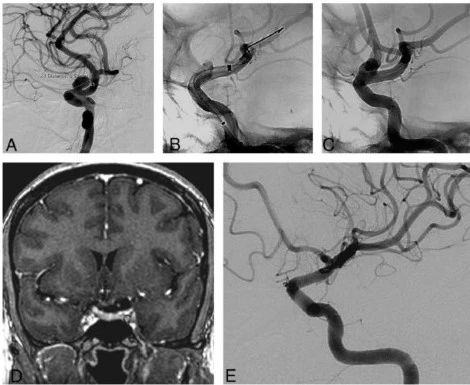 图1. A 左侧颈内动脉床突上动脉瘤;B 血流导向装置后造影显示装置远端贴壁不良(箭头);C 术后血管造影显示FD贴壁良好和FD内支架;D 术后3月冠状位增强MR显示瘤体未显影;E 6月造影随访显示动脉瘤完全闭塞。