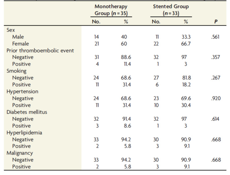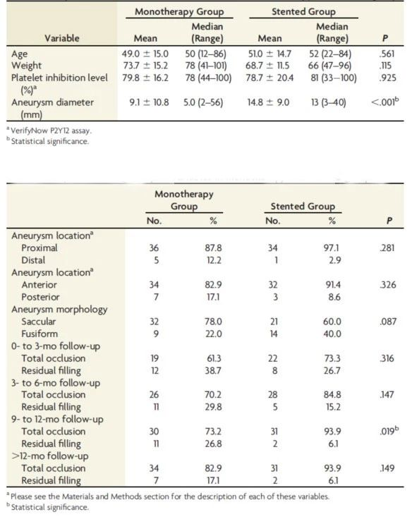 总共68例患者76个动脉瘤,35个患者(41个动脉瘤)仅应用一枚surpass血流导向装置(非支架组),33个患者(35个动脉瘤)在surpass血流导向装置中植入一枚支架(支架组)。使用的支架类型包括:Atlas支架22例;冠脉支架8例;Neuroform、Enterprise和LEO 各1例。两组患者在年龄、性别、体重、血栓病史、吸烟、血小板抑制水平、高血压、高脂血症、糖尿病、恶性肿瘤、动脉瘤位置等方面没有显著差异,支架组的动脉瘤要比非支架组更大(14.8 :9.1 mm, P<.001=。在0-3月和3-6月时,两组病例动脉瘤闭塞率相似(73.3% :61.3%, P=.31, 以及 84.8% :70.2%, P=.14)。9-12个月的时候,支架组的动脉瘤闭塞率显著更高(93.9% :73.2%, P=.019),1年以上的末次随访中,两组病例动脉瘤完全闭塞率没有显著差异(93.9% :82.9%, P=.14)。两组病例都没有临床相关的不良事件和死亡率,随访期间两组病例均有1例发生了载瘤动脉闭塞。非支架组,有2例发生了严重的支架内狭窄。