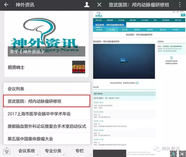 打开神外资讯微信公众订阅号,点击下方会议系统按钮,可看到宣武医院:颅内动脉瘤研修班快捷键(左下图),点击即可观看直播(右下图)。