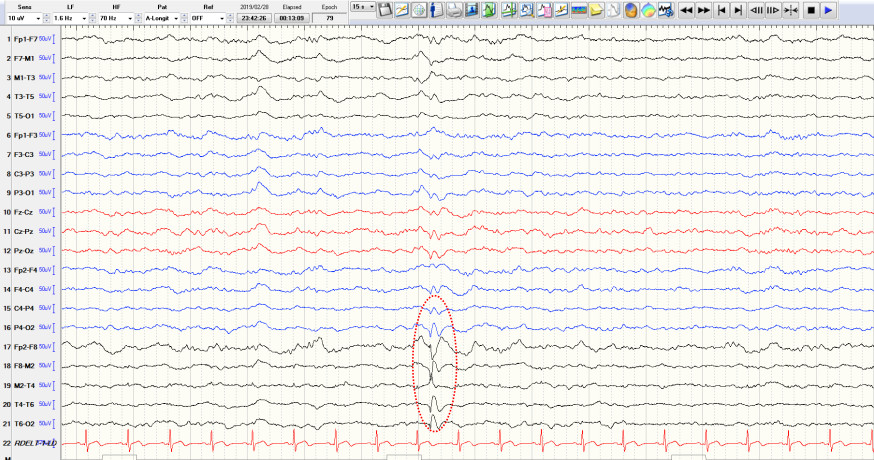 图1. 头皮脑电图提示间歇期右半球棘-慢波,右颞著。
