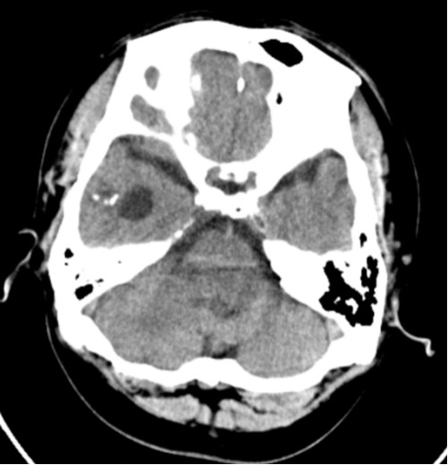 图5. 头颅CT提示右侧颞叶钙化灶。