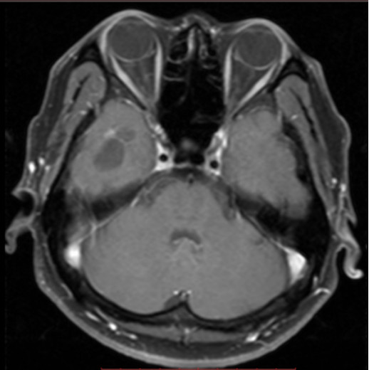 图4. 头颅增强MRI提示右侧颞极囊状病灶周边点状增强。