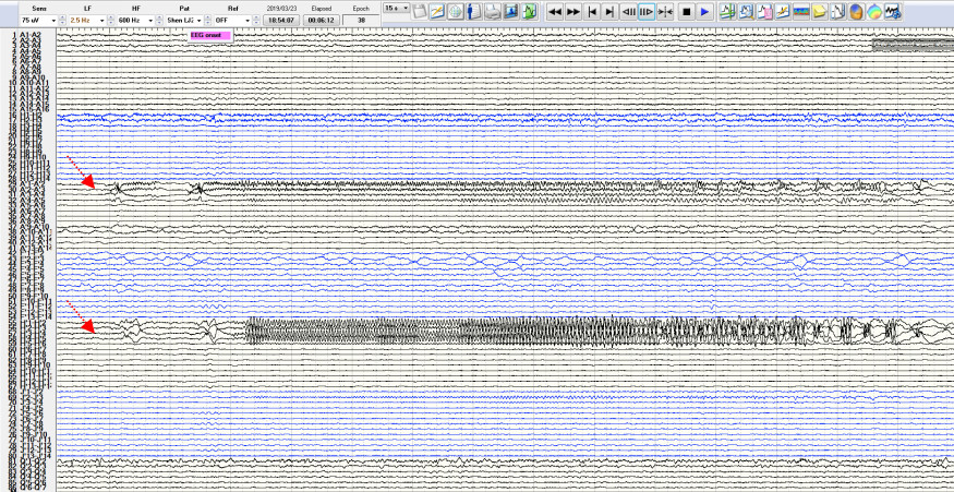 图9. 发作期脑电图,显示癫痫发作的起始电位源于右侧杏仁核及海马。