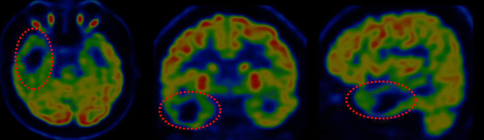 图6. 头颅PET提示右侧颞叶(AOS前)、颞叶内侧结构、岛前,左侧颞叶内侧结构低代谢。
