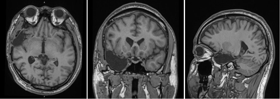 图3. 头颅MRI提示右侧颞极囊状病灶,周围异常信号。