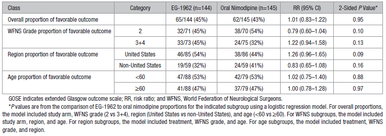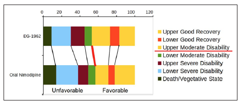 中期分析数据,来自于首批210例患者在治疗后第90天的统计数据。数据显示,即便该项研究招募满员,EG-1962相对于口服尼莫地平达到统计学显著差异的概率很低,不大可能达到研究的主要终点,一个独立数据监测委员会(DMC)根据分析结论已建议终止该项研究。对所有受试者治疗后第90天的随访数据统计,对于主要结局,EG-1962治疗组中GOSE评分为良好结局的受比例为45%,而口服尼莫地平组中为43%(风险比: 1.01, 95%CI: 0.83-1.22, P=0.95,校正的logistic回归)(图1,表1)。