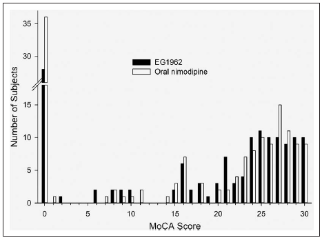 图2. 按组列出的蒙特利尔认知评估(MoCA)结局的分组条形图(EG-1962;n=144;口服尼莫地平;n=145)