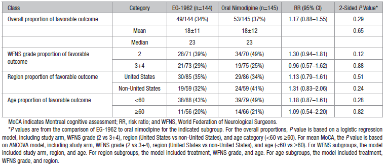 对于次要结局,EG-1962治疗组中蒙特利尔认知评估结果为良好结局的比例为34%,而口服尼莫地平组为37%(风险比: 1.17, 95%CI: 0.88-1.55, P=0.66,意向性治疗logistic回归)(图2,表2)。