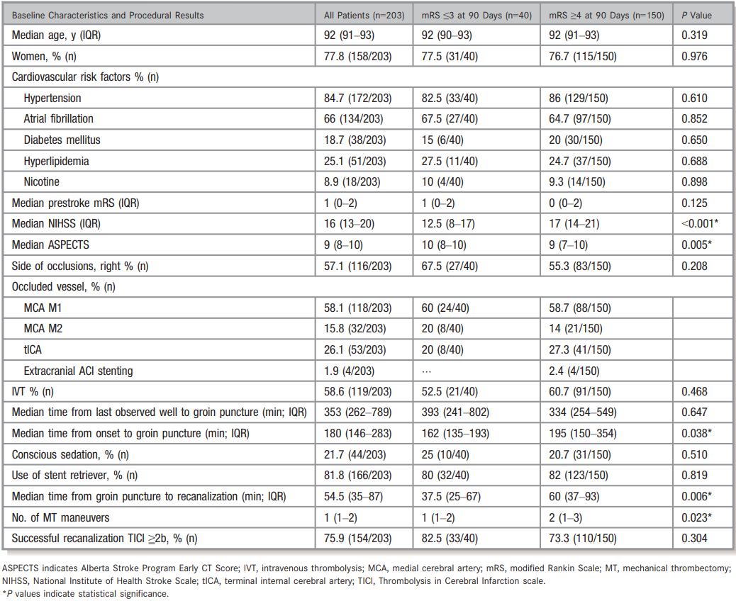 研究者将2015年7月至2018年4月期间GSR-ET(德国卒中登记研究-血管内治疗/ German Stroke Registry–Endovascular Treatment)中入组的所有年龄≥90岁的患者的现有可用数据与来自3家三级卒中中心(Hamburg-Eppendorf医学中心、Bremen-Mitte医院和科隆大学医院)的较小队列相结合。入选标准:(1)前循环大血管闭塞的急性缺血性卒中;(2)接受血管内治疗;(3)治疗时患者年龄≥90岁;(4)卒中前mRS评分0-3分。无关于额外药物治疗(如静脉溶栓等)相关的排除标准。分析了基线特征、血管再通情况(TICI评分)和患者功能结局(mRS评分)以及并发症(症状性颅内出血、严重不良事件)。良好功能结局定义为90天时mRS评分≤3分。