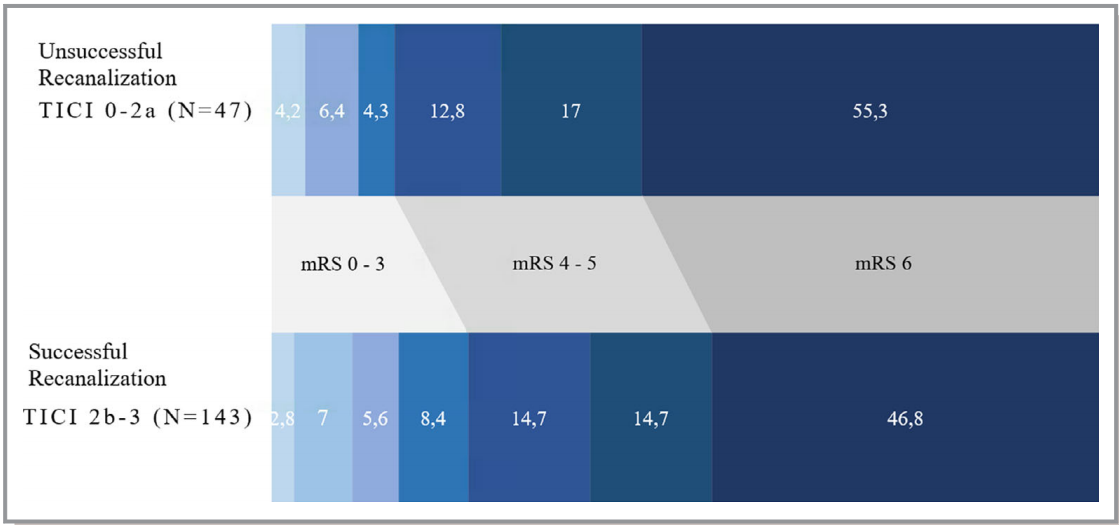 图1根据最终再通状态提供了90天时mRS评分分布的概述。与再通不成功(TICI≤2a)的患者相比,成功再通的患者(TICI≥2b)的mRS分布发生显著(P=0.001)变化,良好功能结局的发生率较高(23.8%[34/143] vs 14.9%[7/47]),90天时的死亡率更低(46.8%[67/143] vs 55.3%[26/47])。