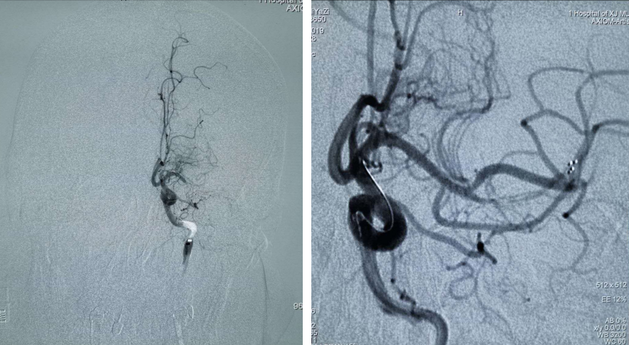 患者发病4小时来新医大一附院,病情危重且在取栓时间窗内,征得患者家属同意后给予取栓治疗。于2019年12月25日行“全脑血管造影术+经皮颅内动脉取栓术”,10:00完成股动脉穿刺,11:50手术结束取出新鲜血栓。