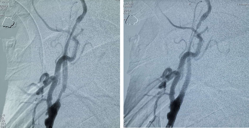 PT导丝携带颈动脉支架通过左侧颈内动脉狭窄处,释放支架后复查造影支架贴壁良好狭窄率不足10%。