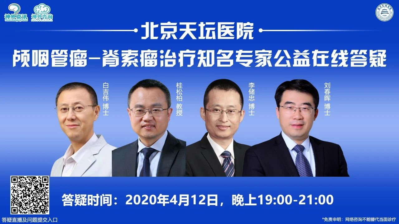 患者问题提交于4月9日启动。4月12日19:00-21:00,桂松柏教授、李储忠博士、白吉伟博士、刘春晖博士将同场带来颅咽管瘤-脊索瘤治疗知名专家公益在线答疑,欢迎观看!