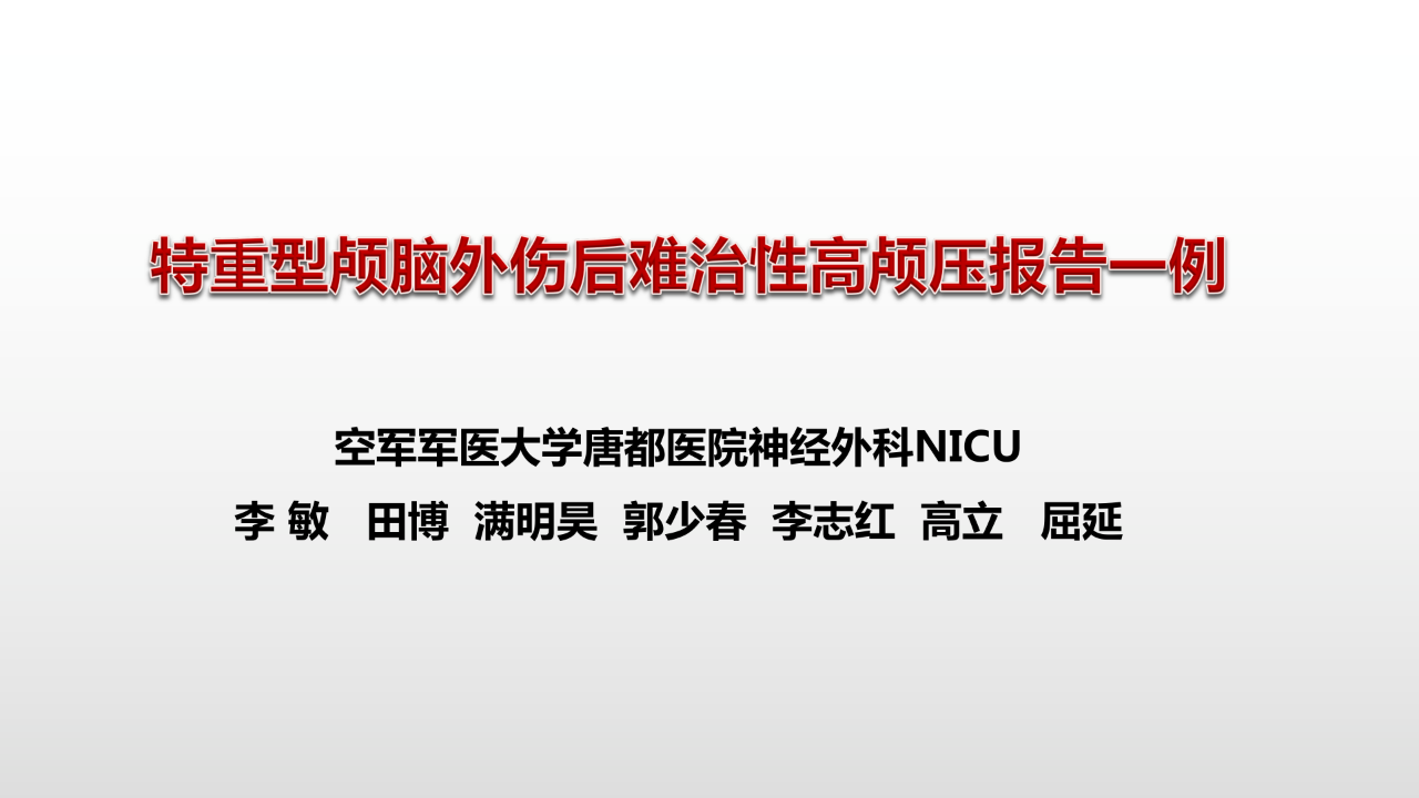 这个病人是我们医院一个很重要的病人,李敏教授付出了非常多的心血,最终也可以说是集我们全科之力,甚至全院之力挽救下来的。关于这个病例,李敏教授主要讲了颅内压的部分,其实颅内压是我们从做医学生开始,从神经外科第1节课开始就接触的内容,只有掌握了颅内压增高的整个病理生理过程,才能对整个神经系统疾病有比较全面的了解。尤其是对于颅脑创伤来说,无论在任何情况下,第1条就是要解决颅内压增高的问题。解决颅内压增高的问题就需要对颅内压增高的原因去进行全面解析,无论是占位、挫伤,还是水肿、血流、脑脊液或者其他的因素。只有掌握了这些,才有可能对比较复杂、比较严重的病例,选择针对性的治疗策略。