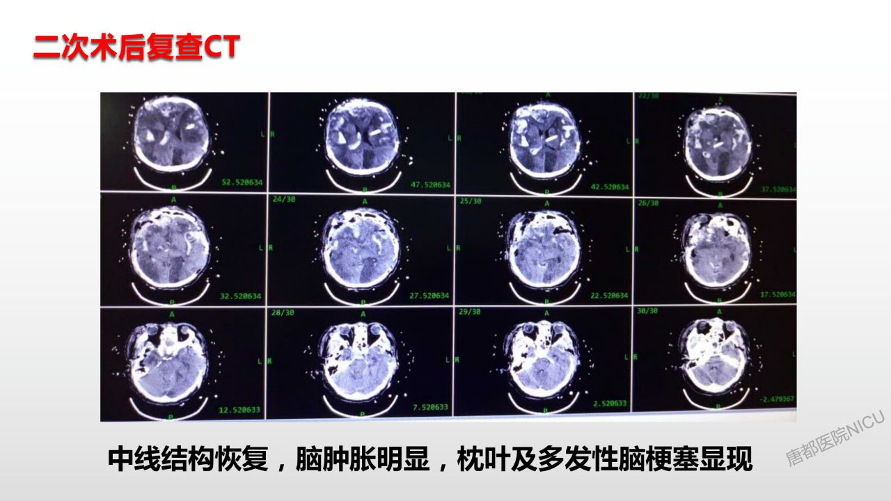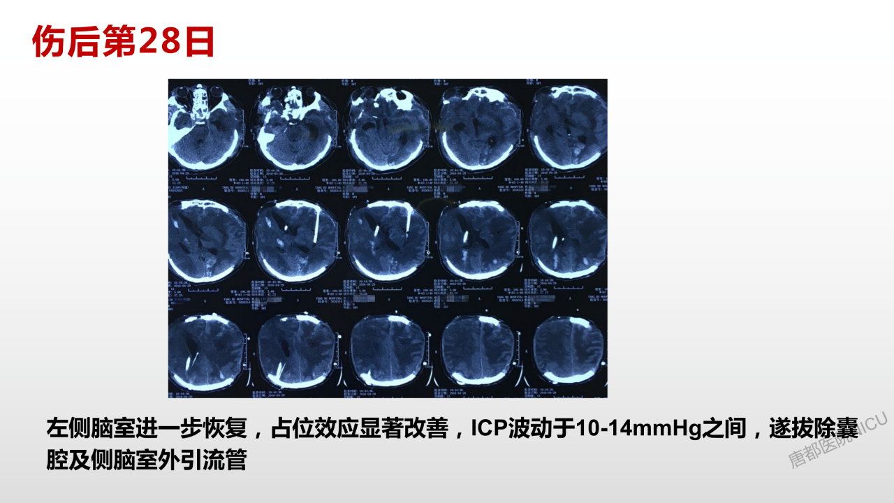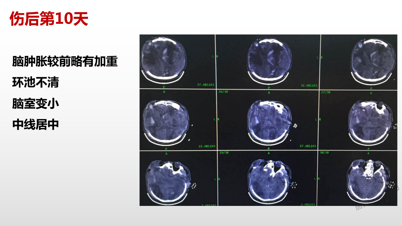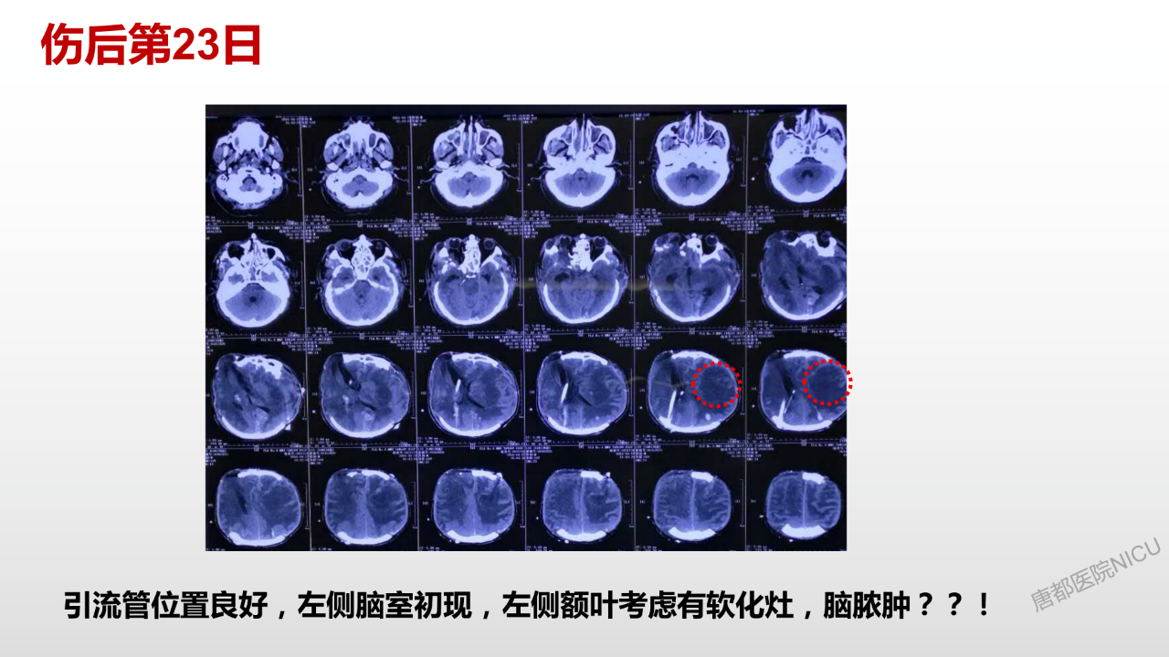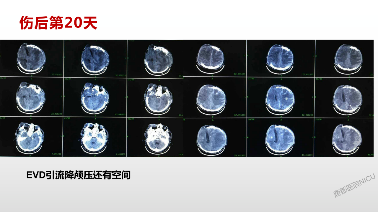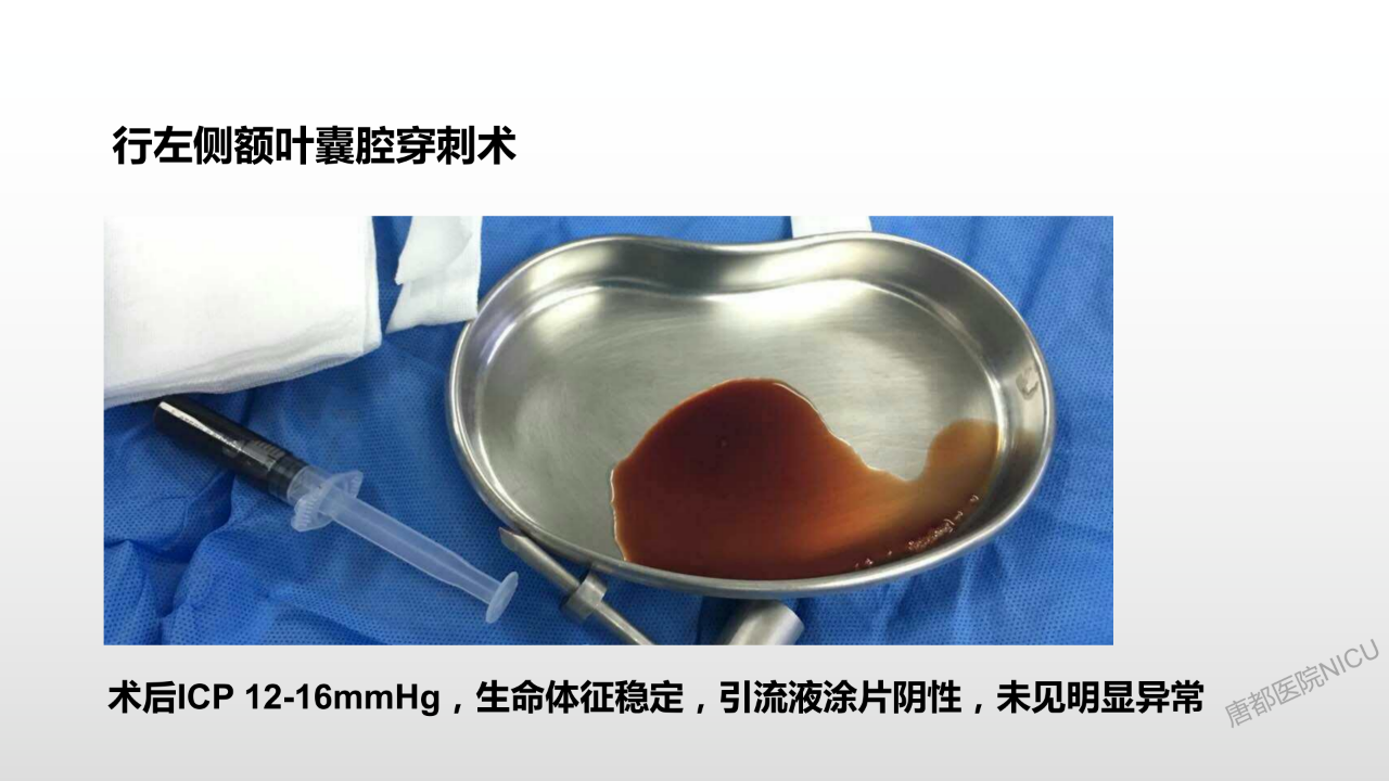 至于囊液问题,它在颅腔内实际上就是个占位,会对颅压有很大的影响,应该要引流出来。这个病例这个时候困难之处就在于可用骨孔钻孔引流位置基本不好找了,所以在我们科里做这种双侧去骨瓣减压的时候,都要求尽量留一个打脑室外引流的位置。多留一点骨头,不会对颅压有太大影响,担可以给我们将来治疗需要的时候留一个备手。