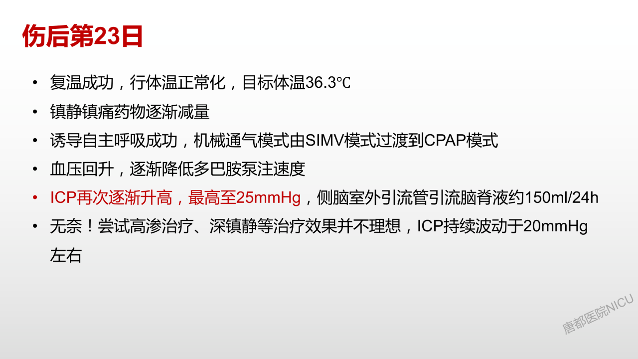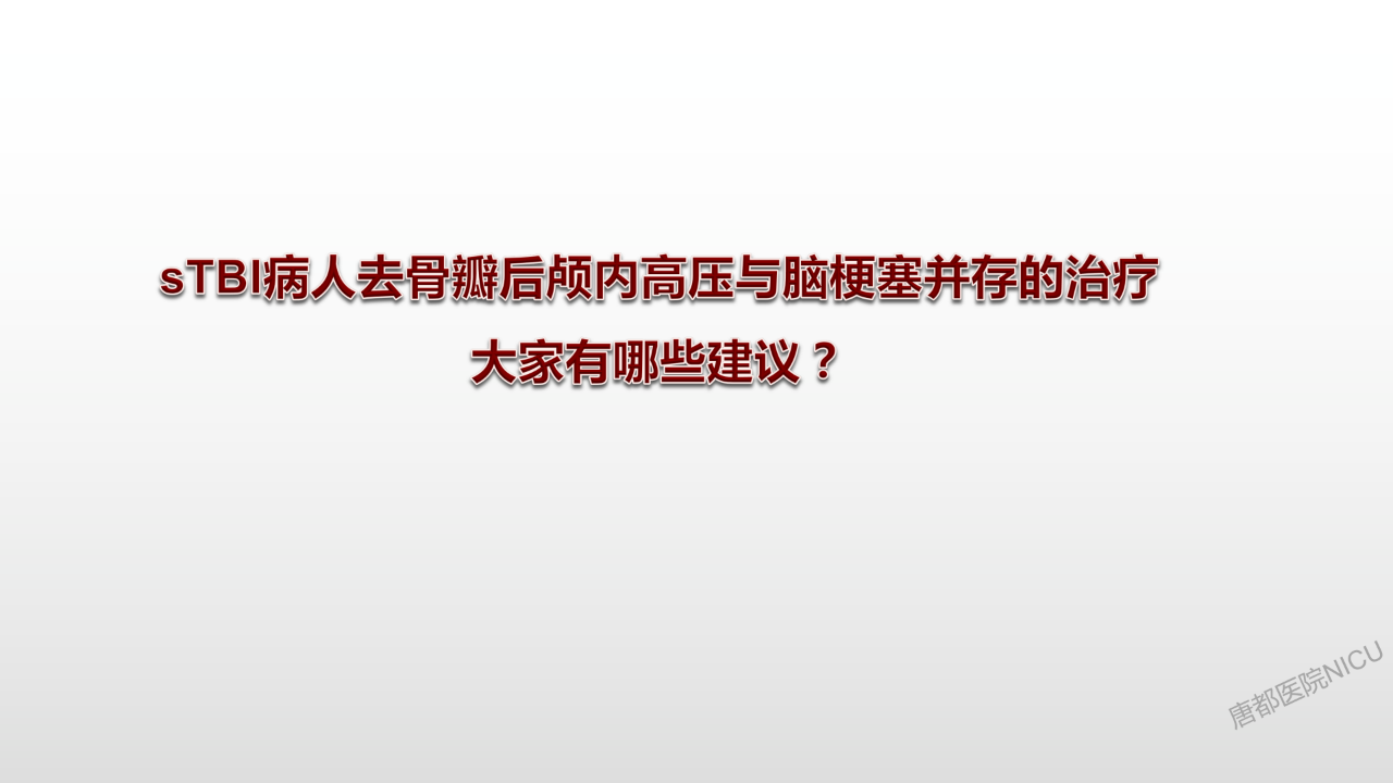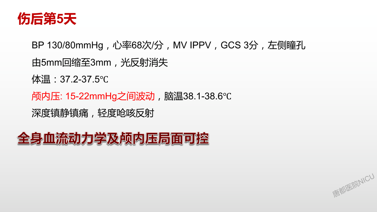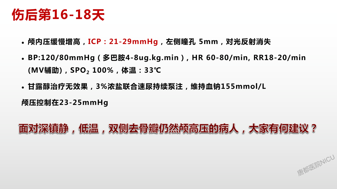 相信大家对于颅内压管控的降阶梯治疗策略都耳熟能详了。但是这个病人在这种特殊的情况下,又该怎么去管理?唐都神经重症是值得全国同仁去学习的。