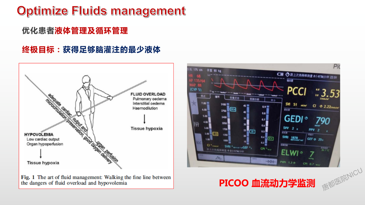 PICCO、脑电、脑血流监测唐都神经重症在这个病人身上都用到了,对于这种重症病人来说,容量不管是少还是多,来回波动对病人都不好,所以需要有合理的容量监测并维持在稳定的状态。另外就是从病人血流角度去做颅内灌注压管理,这个也很重要。比如就像李敏教授遇到的情况,在术后16~19天的时候,压力又增高了,这个时候该怎么处理?像这种情况下的话,手段已经用到极致了,包括低温、其他脑室的引流、整个降阶梯的颅压管理等等。这个时候血流管理可能有一些作用,在保证脑子基本灌注的前提下,把cpp尽量往下压。