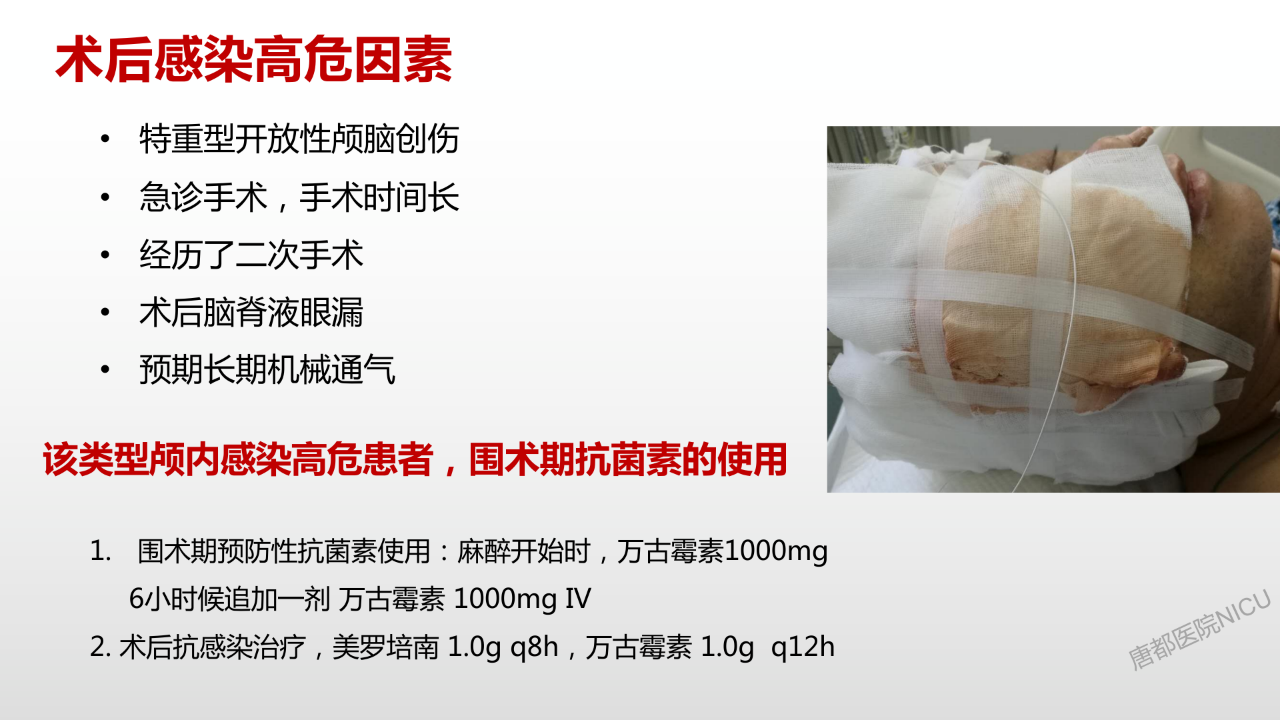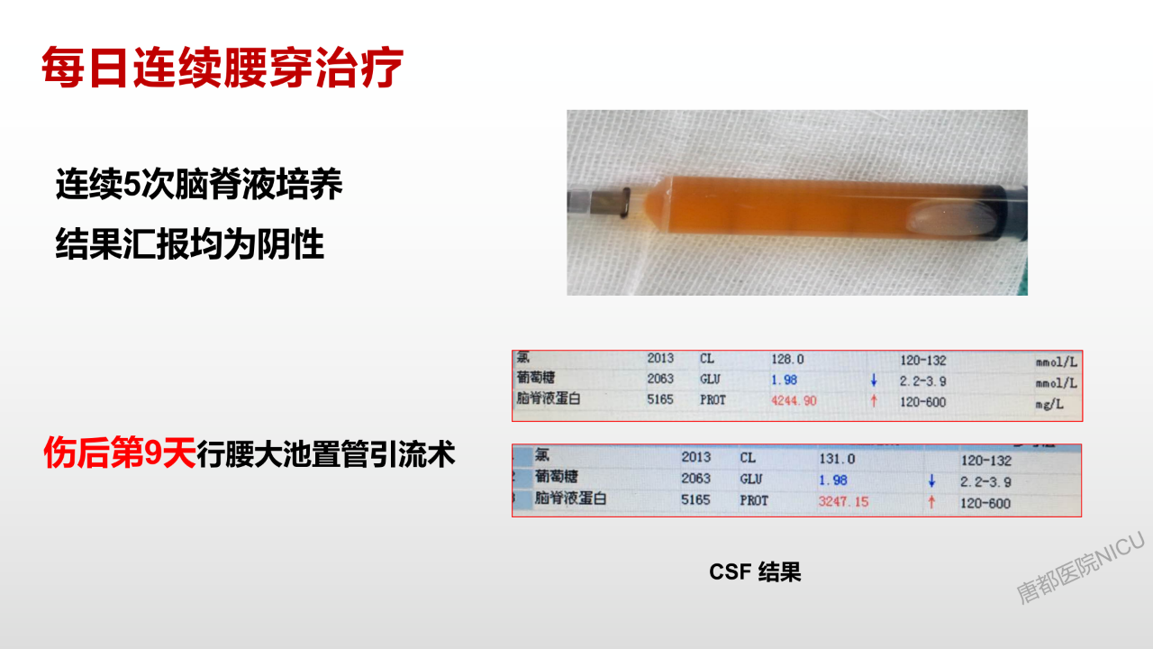 早期这个病人刀口局部脑脊液渗漏还是比较严重。在齐鲁,假如病人是开放性损伤,在硬膜减张缝合等常规治疗都做好的情况下,局部皮肤缺损,我们一般会在外面放负压吸引,但要控制好VAC的负压压力,因为如果压力过高脑脊液会吸出太多。把VAC控制在一定压力下,既能保证不吸出过多脑脊液同时又能保证局部的无菌状况,这个非常重要。同时临床应用看来VAC负压吸引既可以预防局部新发感染,又可进一步降低颅压,我们之前这个病例,VAC吸引后颅压能够下降10mmHg。