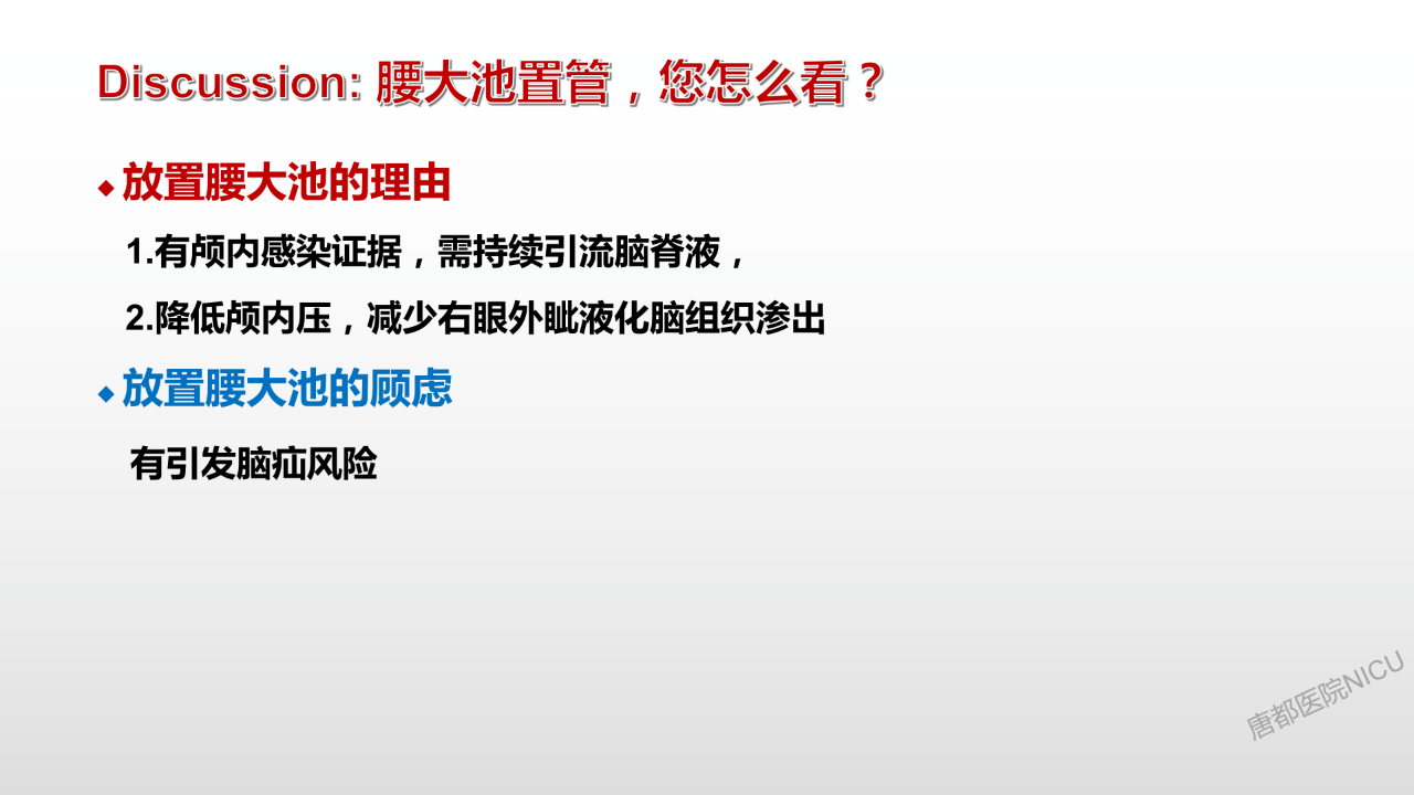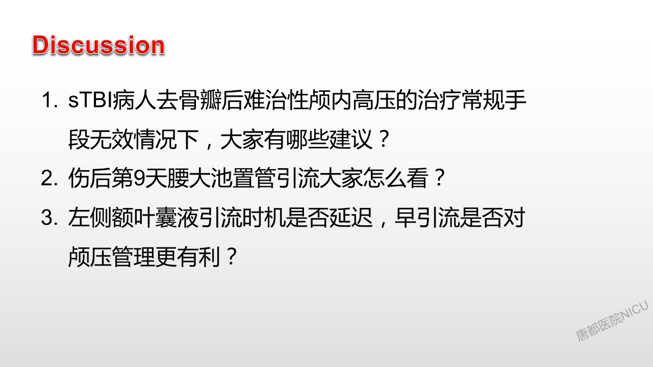 我们对病人的治疗一定是多模态的,就像黄齐兵主任刚才分享的几个经验,虽然是很小的一些细节问题,但遇到每一个不同的病人,在最关键的时候,这些小经验小细节也许就能救病人一命。所以治疗要多模态,要从各个方面来努力,在这个病例中,李敏教授采用了很多的治疗手段,包括关注cpp、减压甚至是带有一点冒险性质的放腰大池引流和囊液穿刺,正是将每一个细节都做好了,才把病人导向了好的结局,最终挽救了病人的生命。