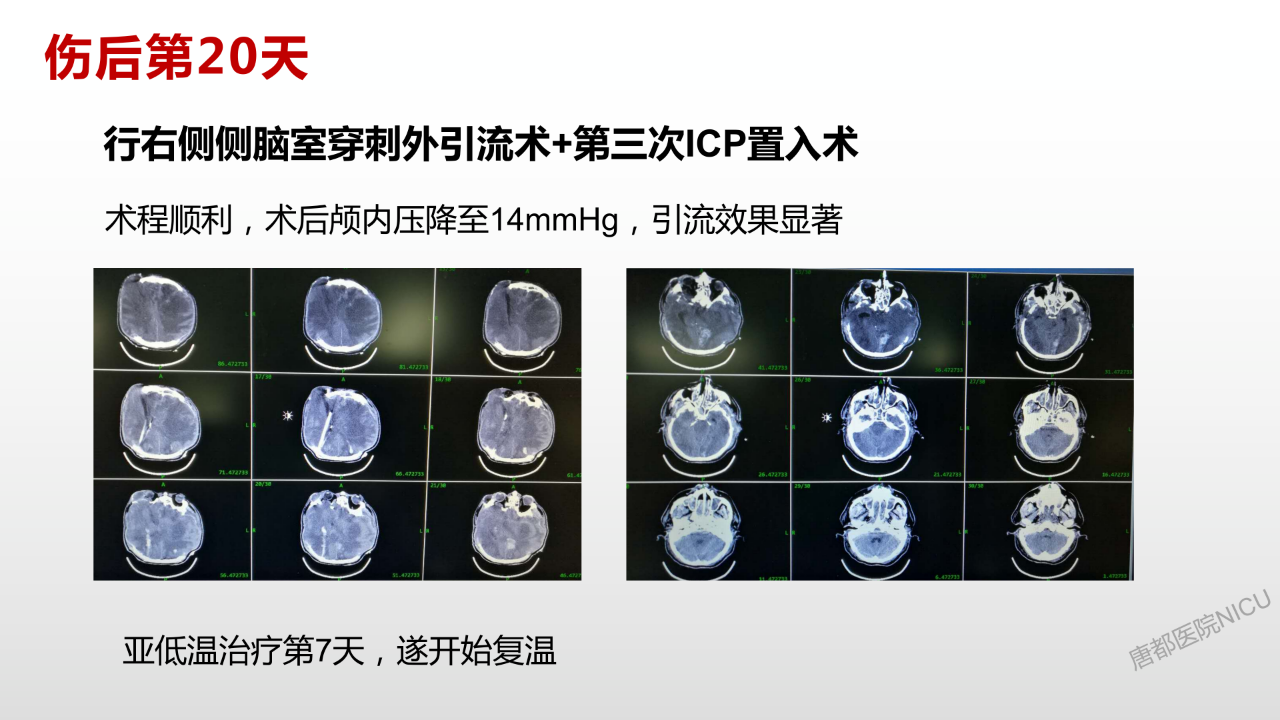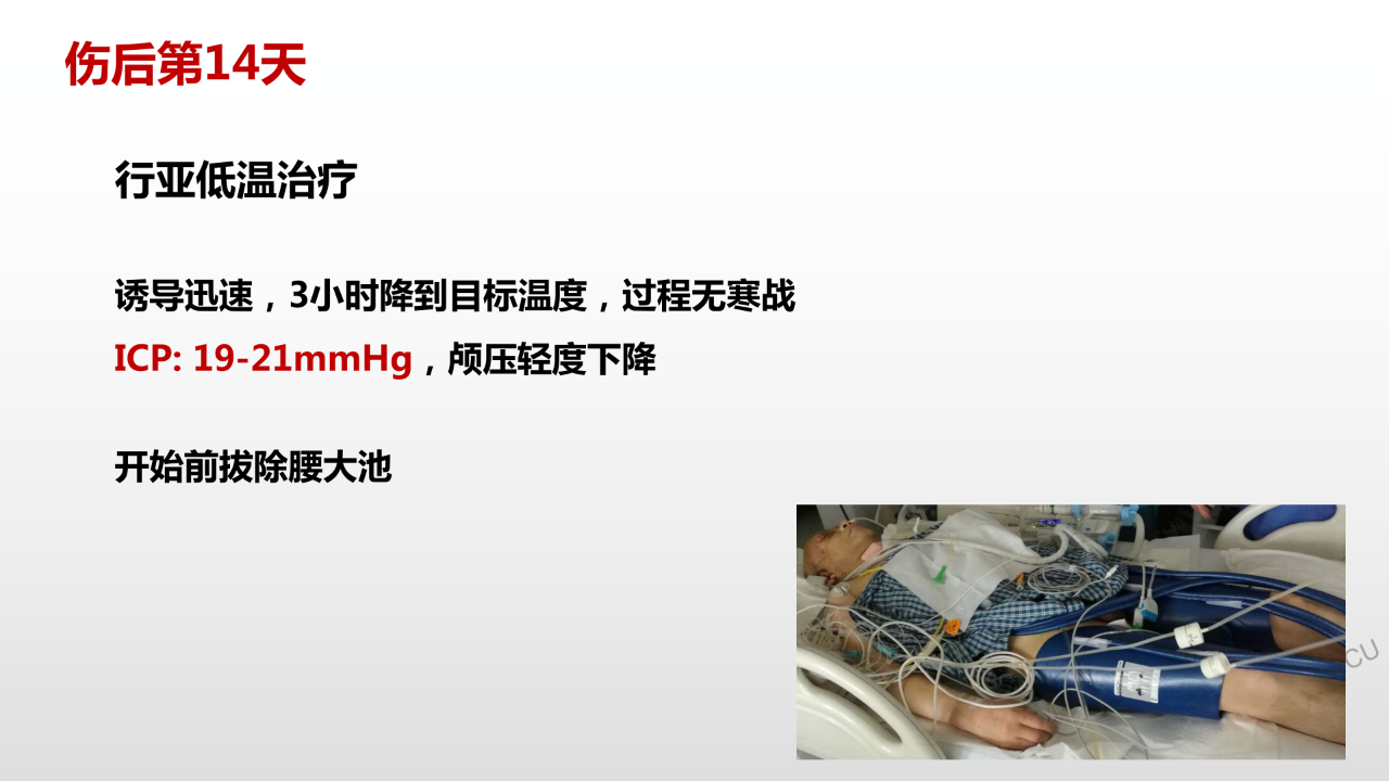 另外腰大池引流的话,李敏教授没有把这个时间点的影像放出来我不敢确定当时时机是否合适,我的原则是一定要看到环池、脑脊液循环通路通畅,不然不会放腰大池引流。低温这一块我可能一开始就做,假如没有创伤凝血病的话,把温度做的再低一些,可能对于防止颅脑弥漫性肿胀会有帮助。