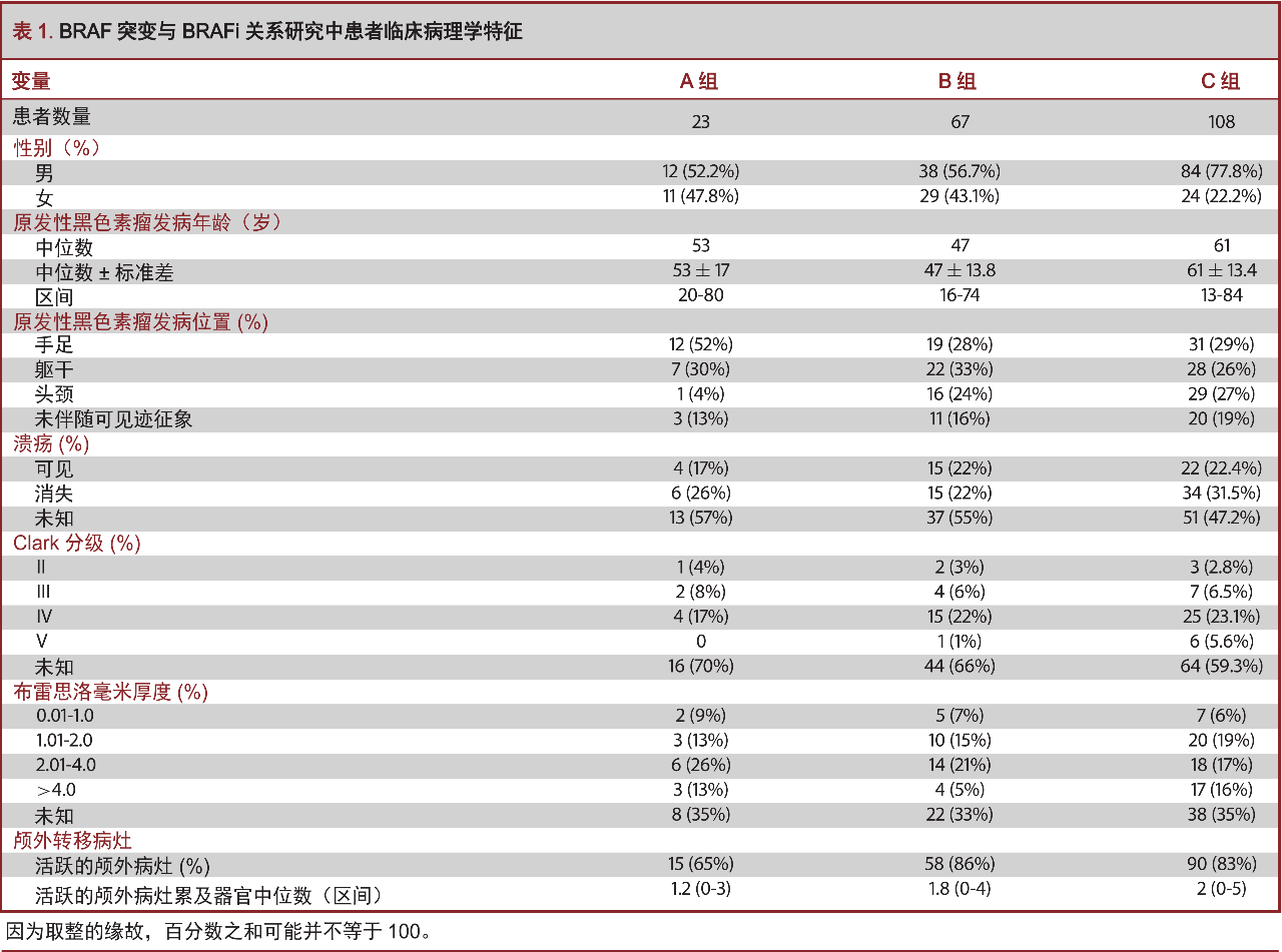 共198例患者纳入到研究分析中,90例(45.5%)患者携带BRAF突变,108例(54.5%)患者为BRAF野生型(补充的电子表格1)。A组患者为23例(11.6%),B组患者为67例(33.8%),C组患者为108例(54.5%)。患者的临床病理学特征均详细记录于表1,2。按机构划分的患者群体的临床特征记录(补充的电子表格2)。
