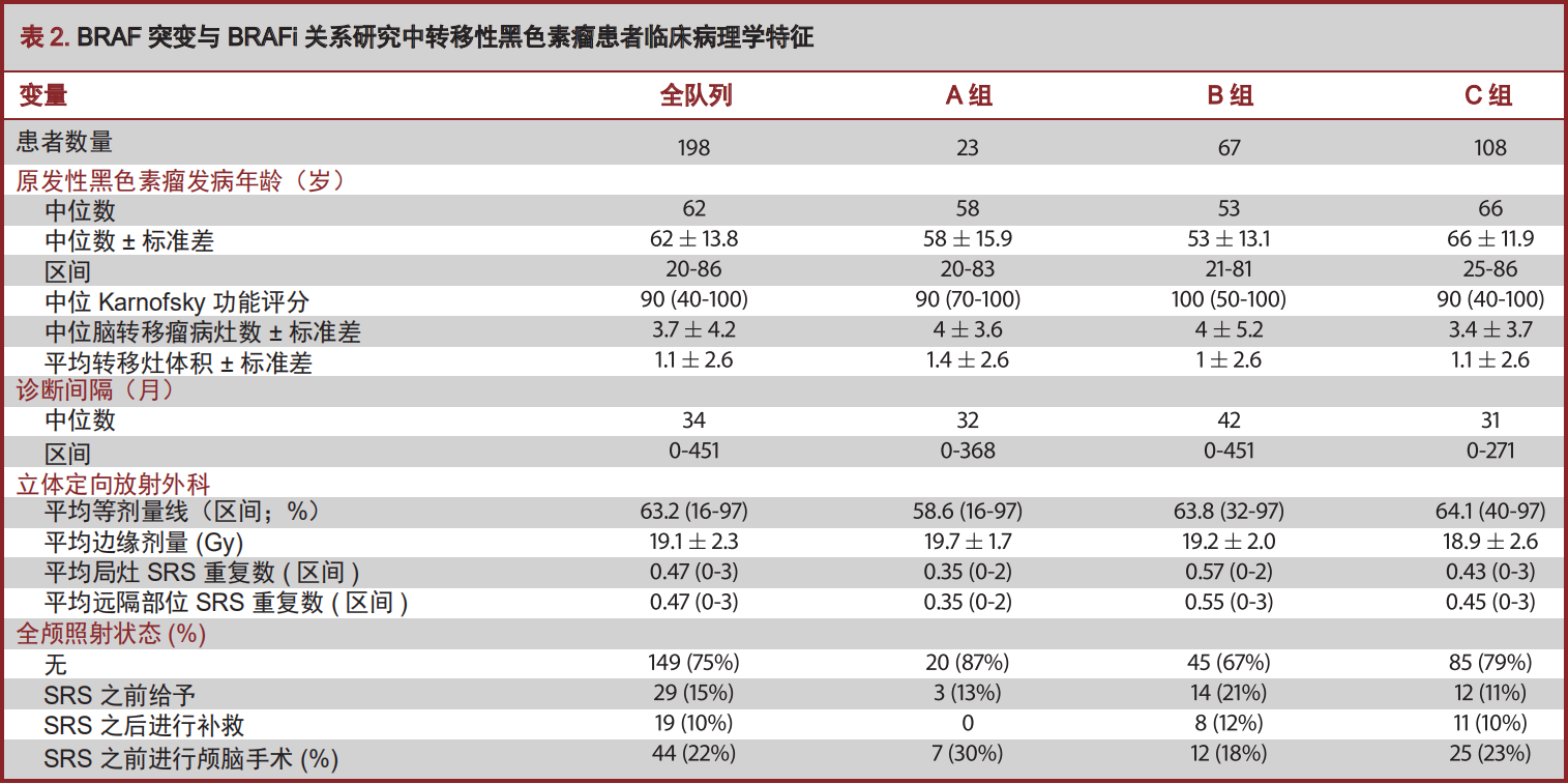 此项多中心回顾性队列研究纳入了自2011至2015年以来198例伴有BRAF突变并被实施立体定向放射外科治疗(stereotactic radiosurgery,SRS)的黑色素瘤BM患者,应用Kaplan-Meier方法学以及多因素回归分析对患者基于每个指标的生存进行了比较。