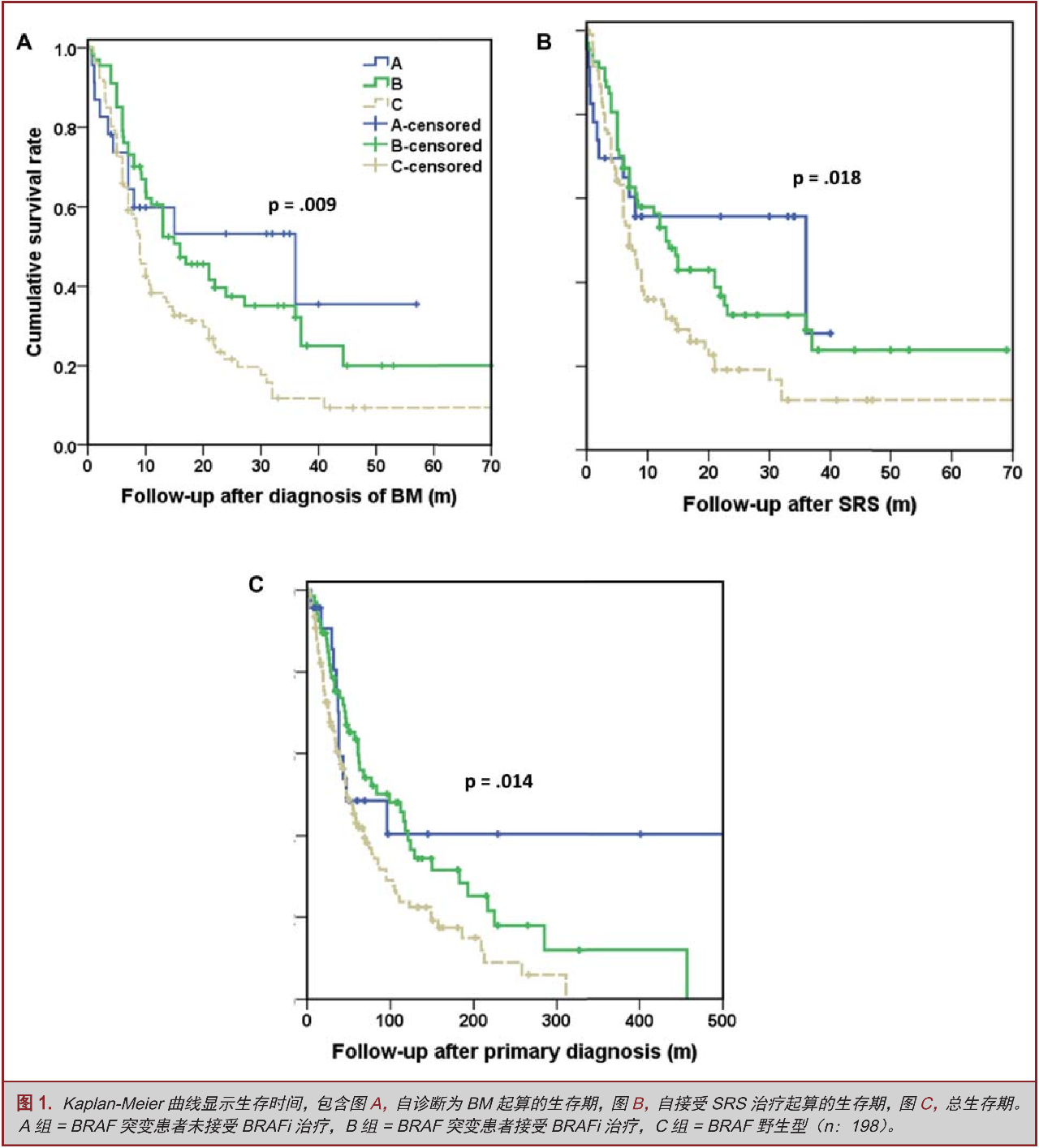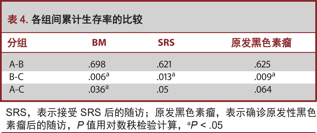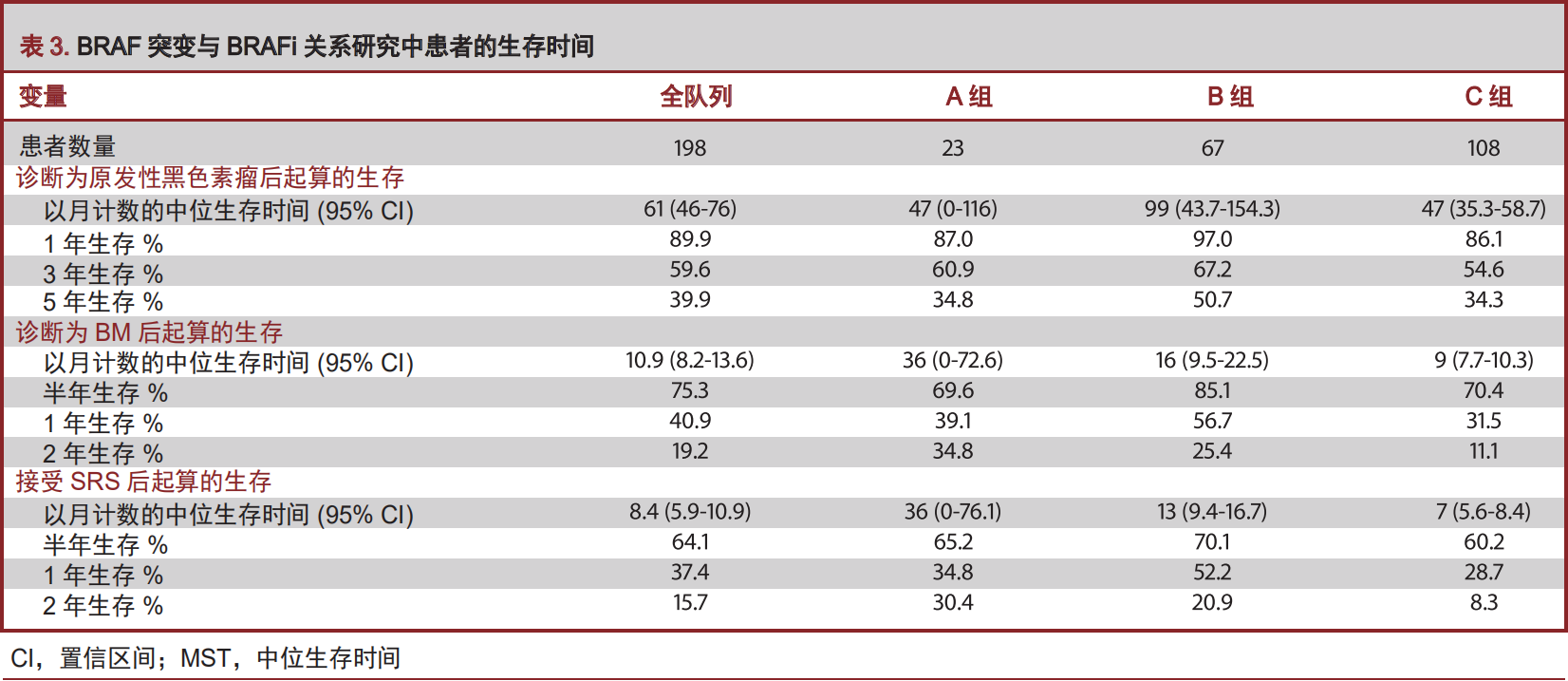 A组患者诊断为原发黑色素瘤的中位年龄为53岁,B组是47岁,C组是61岁(表1)。A、B、C组患者诊断为BM的中位年龄分别为58岁、53岁和66岁(表2)。BRAF突变组患者与BRAF野生型患者确诊为BM的年龄分别为58岁与66岁,差异显著(P<0.01)。与之相类似,BRAF突变组患者与BRAF野生型患者分别确诊为原发性黑色素瘤的年龄分别为49岁与61岁,差异显著(P<0.01)。两组之间在确诊为原发性黑色素瘤至颅内发生转移的时间并无差异(P=0.09)。很有趣的是,在我们的队列中BRAF野生型患者组(C组)中,男性占到77.8%,而A组男性占到52.2%,B组男性占到56.7%,差异显著(P<0.01)。在各组间颅外肿瘤负荷并无统计学的差异(表1)。诊断确立时,患者KPS评分从40至100,中位KPS评分为90;9例患者KPS低于70。中位BM数量为3.7,平均体积为1.1cm³,各组间并无统计学差异。SRS治疗边界剂量为19.1Gy,等剂量线跨度为16%至17%。在我们的队列中,37%的患者接受了1至3个部位的SRS治疗。各组间重复应用SRS治疗次数并无统计学差异(表2)。