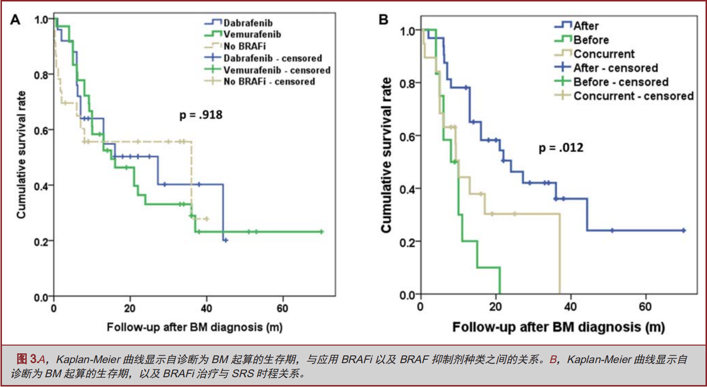 我们也评估了黑色素瘤患者确诊BM诊断后,BRAFi应用时机对于患者生存率的影响。我们将B组患者区分为接受SRS治疗至少一周后,再行BRAFi治疗组,以及接受SRS治疗之前即行BRAFi治疗组、SRS治疗与BRAFi治疗同步进行治疗组。需要特别指出的是,SRS治疗与BRAFi治疗同步进行治疗组中,BRAFi治疗是与SRS治疗同一天进行的。纵观B组患者,区分为接受SRS后,再行BRAFi治疗组,以及接受SRS之前即行BRAFi治疗组、SRS与BRAFi治疗同步进行治疗组患者分别为36例、12例以及19例。它们的中位BM生存期分别为24(CI 11.2-36.7)个月、8(CI 4.0-11.9)个月、10.1(CI 8.4-11.7)个月(图3B)。SRS治疗后接受BRAFi治疗者较之SRS治疗前接受BRAFi治疗,以及SRS治疗同期接受BRAFi治疗者,生存明显获益(P<0.01;P=0.007)。