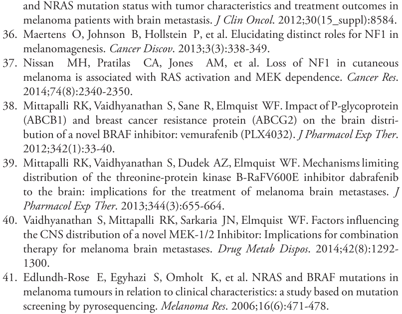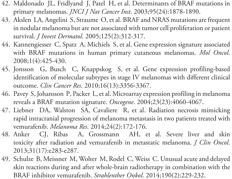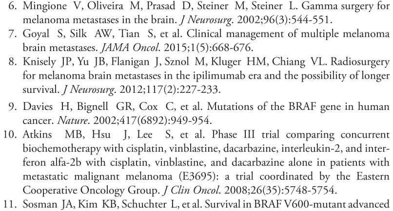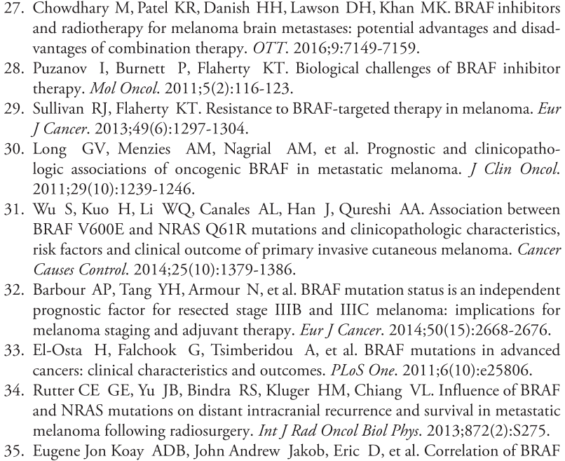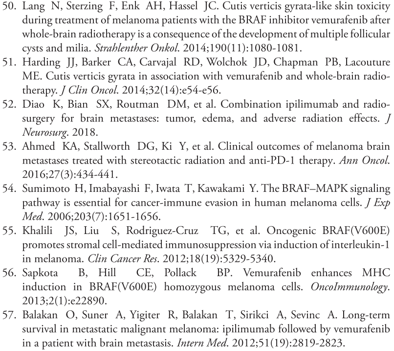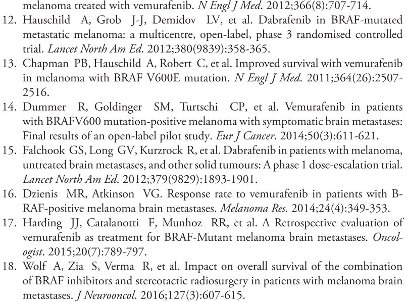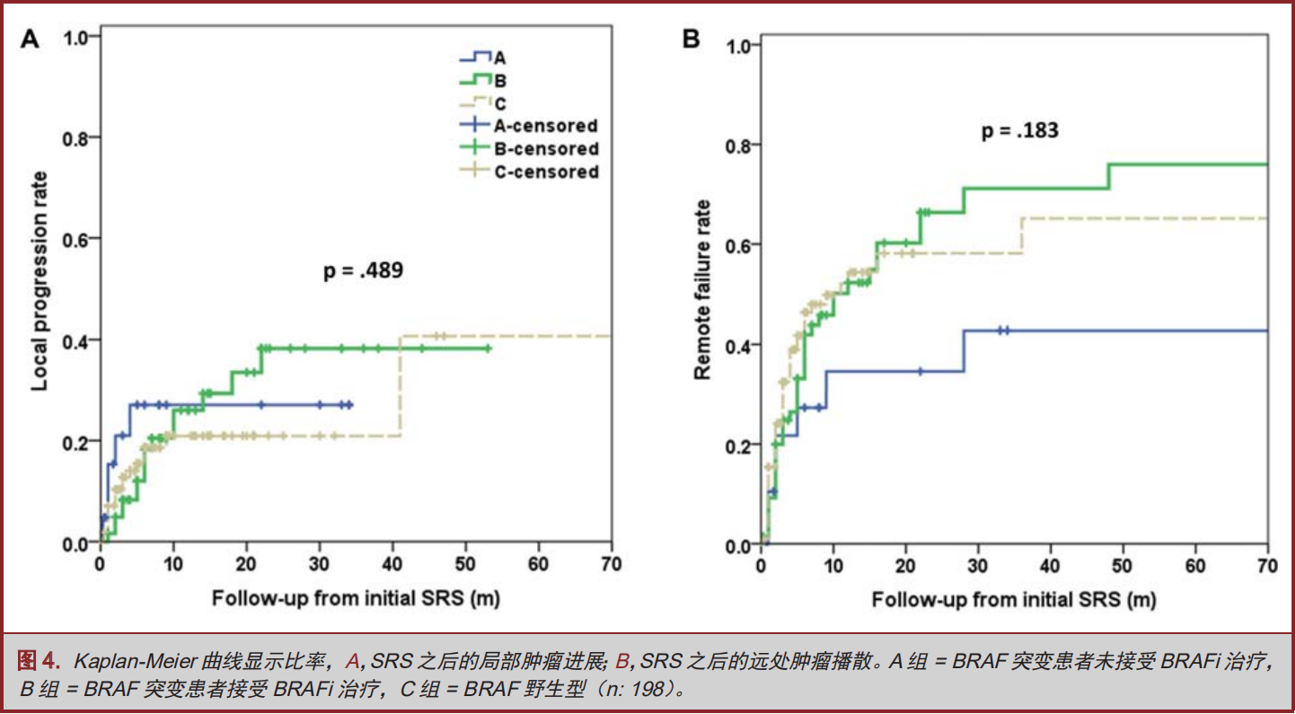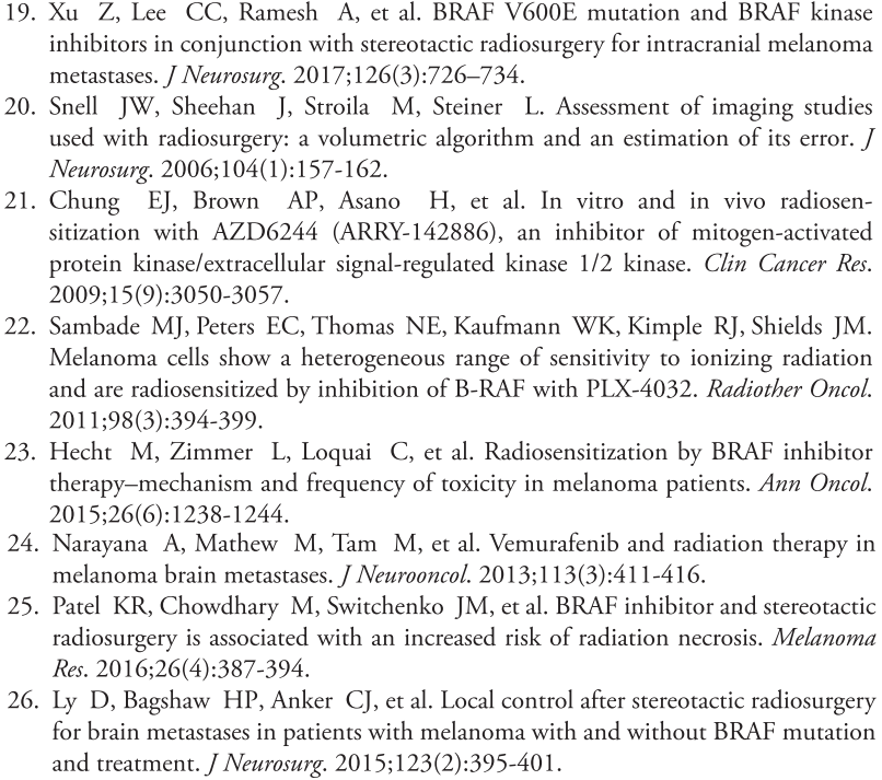 广泛应用BRAFi情况下,对于接受SRS治疗的黑色素瘤BM患者来说,BRAF突变是一项独立、显示有较好预后的预测指标。立体SRS治疗后,至少间隔一周再接受BRAFi治疗,效果最佳。但BRAFi会增加无症状脑出血的发生率。