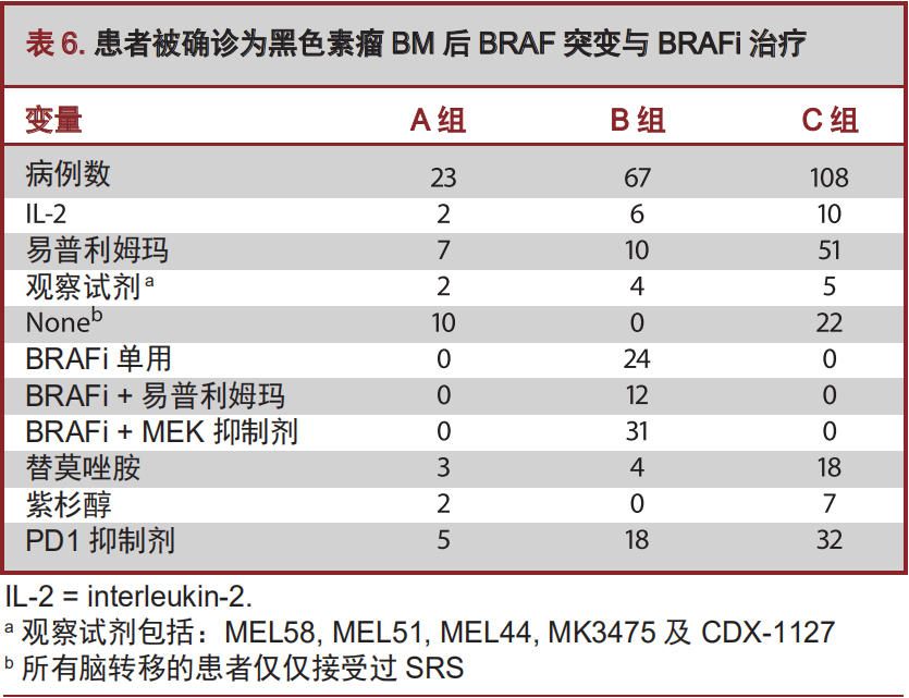 这项回顾性研究有其内在的缺陷,包括对患者难以避免的选择偏倚,同时,我们这一队列中的患者被给予了异质性治疗,随访也是由各个研究机构自行完成的。现实生活中,BRAFi被广泛应用,本研究纳入了相当数量的患者,在比较A组与B组患者时,其权重为0.72,无疑,这一数据是被低估了。而且,本研究设计中,并未涉及观察中枢神经系统有无疾病进展、中枢神经系统以外的其他系统有无疾病进展,以及中枢神经系统和中枢神经系统以外直接导致患者死亡的病情变化。黑色素瘤细胞对治疗发生响应以及对放射线敏感,均涉及许多变量,这些均有待于进一步的研究。
