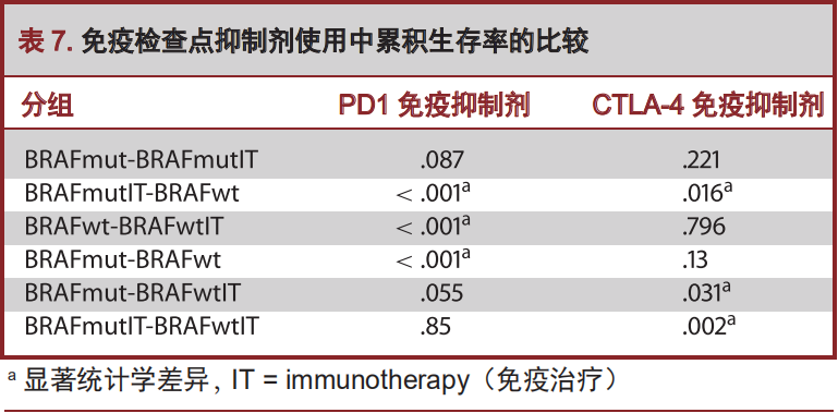 恶性黑色素瘤的治疗方法在表6中被详细列出。A组23例患者中,30%的患者接受免疫抑制剂CTLA-4治疗,21%的患者接受PD-1治疗。B组67例患者中,32%的患者接受免疫抑制剂CTLA-4治疗,26%的患者接受PD-1治疗。108例BRAF野生型患者中,47%的患者接受免疫抑制剂CTLA-4治疗,29%的患者接受PD-1治疗。在各组间,无论是使用CTLA-4或PD-1治疗,并无显著统计学差异。基于我们的多变量回归分析,使用CTLA-4与生存率没有相关性(表6)。