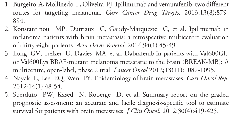 这项回顾性研究纳入了来自四家研究机构,共198例黑色素瘤患者,该研究一定程度上尝试去阐明黑色素瘤BM患者治疗的复杂性,对已存在的治疗方式的内在机制进行了探讨。本研究的亮点,在于显示了有BRAF突变的黑色素瘤BM患者,他们接受BRAFi治疗后,生存远远比那些未接受BRAFi治疗的突变患者要好。然而,也很明显,参与研究的这四家机构平素对黑色素瘤BM的治疗模式本就大相径庭。比如,研究机构1极少开展手术治疗。研究机构2对70%患者实施了WBRT,而实际上,这部分患者中的大多数应该实施手术治疗,但事实上,却未做。所以说,选择偏倚可能是巨大的。此外,只有一部分患者接受了BRAFi治疗,而大多数患者则接受了其他的治疗方式。使用BRAFi与发生较高的颅内出血的风险相关。正是因为研究机构对治疗方式选择的差异,所以,很难得出结论,到底哪一种治疗方式是最好的。针对已存在的观念,比如,靶向治疗可以降低新BM的发生风险,或者靶向治疗可以用来处置已经发生的转移瘤,这些均需要进一步厘清。与此同时,脑转移瘤的放射外科治疗,仍是治疗的最佳选项,与WBRT相比,它极大程度上避免了脑白质病的发生。当黑色素瘤转移至颅内,BRAFi治疗以及其他的靶向免疫治疗作用机理又当如何,这些都需要开展更多的研究去阐明。