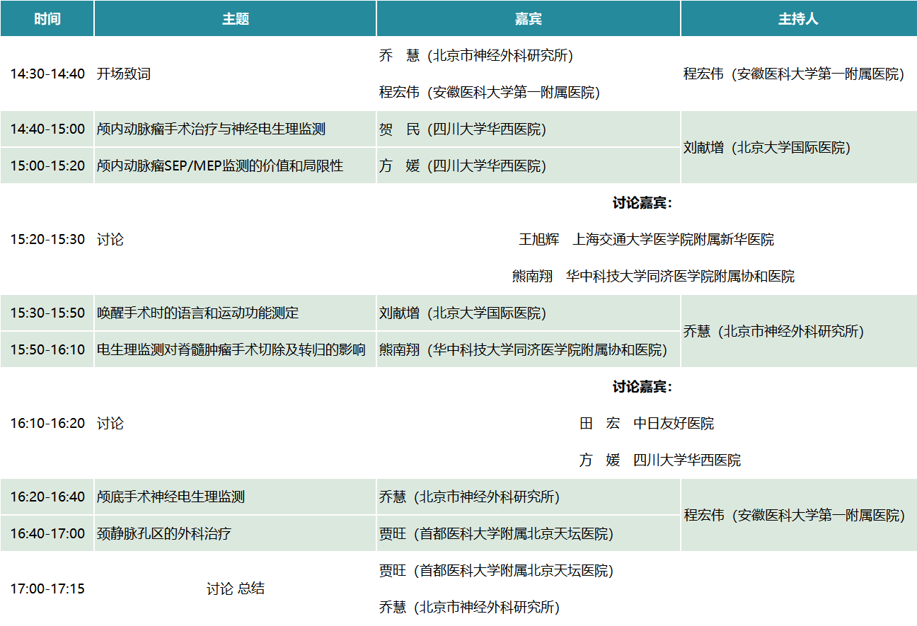会议介绍突如其来的新冠肺炎疫情牵挂着每一个人的心,在这个特殊的时期,由中国医师协会神经外科医师分会第五届委员会神经电生理学组主办的——术中神经电生理规范化诊疗专题研讨会将于2020-05-23举行线上会议。本次会议将秉承理论与实践相结合的传统,期待与您一起在探索中进步,共享学术新发展!期待您拨冗参加!日程安排点击图片即可放大查阅讲者介绍神外资讯经主办方授权发布本通知。