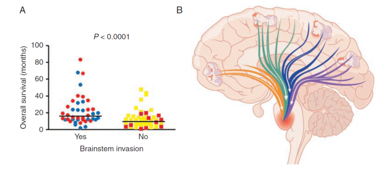 A.脑干浸润与患者的生存。(红色为本研究数据,蓝色和绿色为以往的研究数据),B.多种不同白质显微从皮质经中脑延伸到脑桥,包括额桥束(橙色)、皮质脊髓束(绿色)、顶桥束(蓝色)和枕桥束(紫色)。(颞桥束在图平面的内侧和外侧),这样的传导束是的大脑中任何地方产生的GBM科技进入脑干的重要结构。
