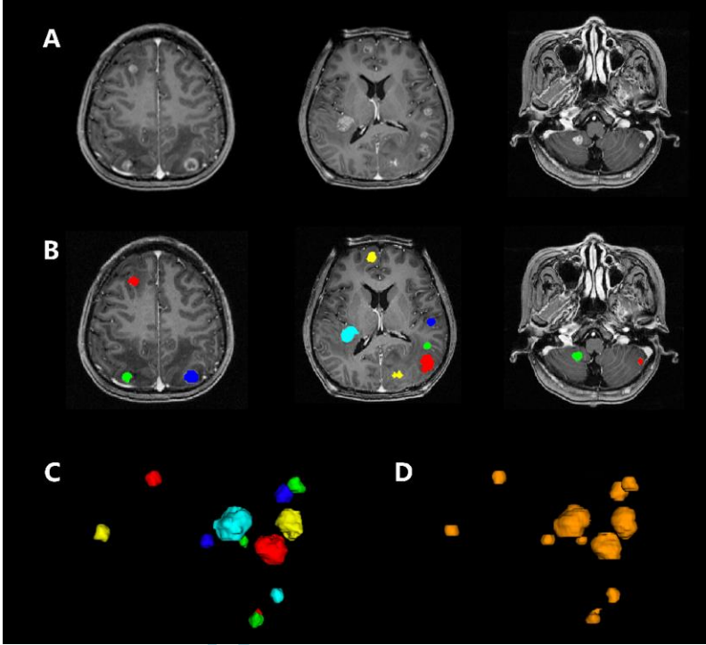 利用BMDS网络分割多个脑转移瘤。图为一67岁男性肺癌脑转移患者。3D T1-MPRAGE增强图像显示脑内多发转移灶(A)。(B)使用不同颜色的标签手工分割,(C)肿瘤的手动分割空间视图,BMDS网络自动分割(D)与手动分割高度一致。