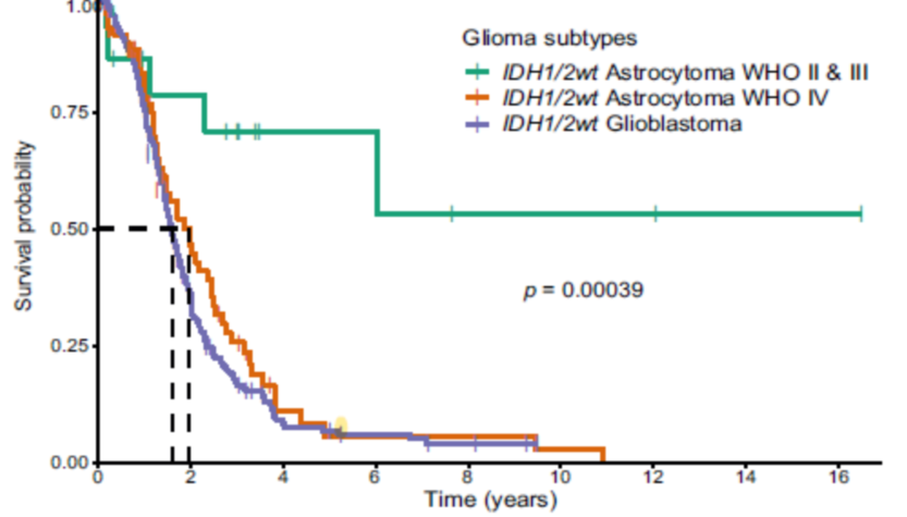 1.IDH1/2野生型具有胶质母细胞瘤的分子特征的WHO IV级弥漫性星形细胞胶质瘤的生存率研究:cIMPACT-NOW标准的实践