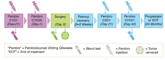 为了分析抗PD-1治疗复发胶质母细胞瘤失败的原因,作者设计II期临床试验观察帕博利珠单抗(PD-1抗体)治疗复发胶质母细胞瘤后肿瘤微环境中免疫细胞构成和免疫分子表达情况。纳入条件:需要再次手术的、18岁以上复发GBM病人,KFS评分≥60,每天给予的地塞米松不超过2mg。常规流程:在术前第21天和术前1天分别注射帕博利珠单抗200mg,术中留取病人肿瘤组织进行分析。术后恢复2-3周后注射帕博利珠单抗200mg,3周后再注射一次,随访24个月。