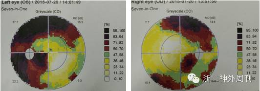视力视野检查:视力右侧远视100散光25、矫正0.6;左侧远视100散光75矫正0.3。视野见(图2)。
