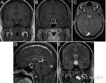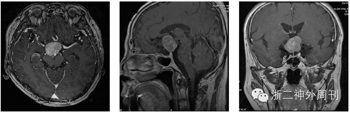 患者1周前当地医院体检,头颅MRI平扫提示:鞍上池占位;双侧基底节脑缺血灶,双侧脑室旁白质脱髓鞘改变。遂来我院进一步诊治。增强头颅MR提示:鞍上池占位,考虑脑膜瘤可能,颅咽管瘤不除外(图1)。