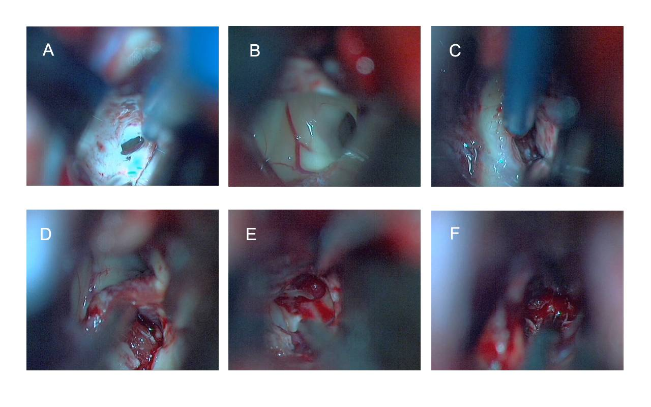 图4. A:显示沿大脑镰牵拉开额叶,暴露胼胝体,沿中线切开胼胝体,可见侧脑室;B:经侧脑室可见左侧室间孔;C:在侧脑室脉络丛内侧,经透明隔-穹窿间进入三脑室内;D:探及三脑室内肿瘤;E和F:可见肿瘤血供较丰富,质地偏韧,行部分切除肿瘤。