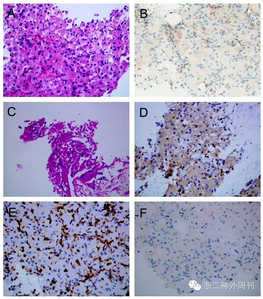 图5. 术后免疫组化结果:A: H&E染色;B:EMA染色;C:PAS染色;D:CD68染色;E:CD163染色;F:GFAP。