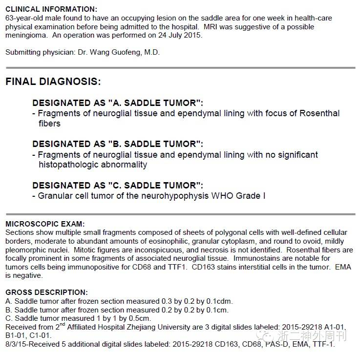 我院病理科根据细胞形态及排列,和免疫组化结果,诊断排除了脑膜瘤、垂体腺瘤和颅咽管瘤。因一时无法对该病例做出确切的病理诊断,故请UCLA远程会诊。UCLA会诊意见:考虑多形细胞呈小片样排列,细胞边界清楚,胞浆呈中到重度的嗜酸性,并伴有颗粒样改变。细胞核呈圆形或类圆形,轻度多形性。有丝分裂像不多见。未见有坏死组织。结合免疫组化,考虑为颗粒细胞瘤(GCT),WHO I 级。