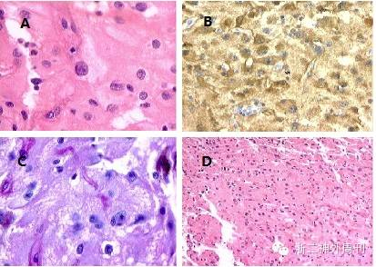 图8. A和B(H&E染色)显示肿瘤细胞呈多边形,胞浆呈嗜酸性,细胞核形态多样,肿瘤细胞呈分叶状分布;C 肿瘤细胞颗粒呈现PAS染色阳性,且可抵抗淀粉糖化酶消化;D 神经元特异性烯醇酶染色阳性[4]。