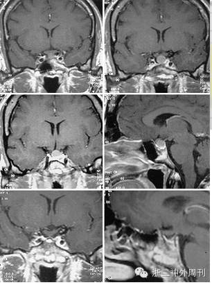图6. 上方及中间共4图,显示一例术前表现为肢端肥大症的42岁女性GCT患者MRI,肿瘤位于垂体上方;下方2图为术后5个月MRI检查结果[5]。