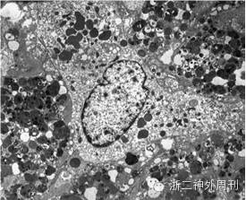 图9. 电镜显示GCT肿瘤细胞内含大量膜包绕含电子致密液泡,似溶酶体[5]。