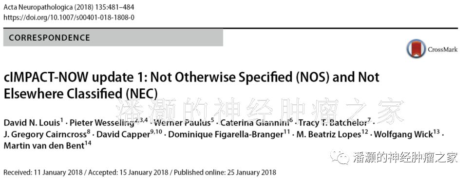 为此国际神经病理协会(the International Society of Neuropathology,ISN)在2017年成立cIMPACT-NOW(Consortium to Inform Molecular and Practical Approaches to CNS Tumor Taxonomy-Not Official WHO)这一协会组织,旨在评估推荐将来可能进入CNS肿瘤分类中的信息,并将最新的诊断相关的共识进行评估,以决定这些信息是否能够纳入将来新版的CNS肿瘤分类之中。值得注意的是,cIMPACT-NOW不是对已有的WHO分类进行补充,而是给诊断医师提供可能的一致推荐意见以及潜在的WHO分类更新信息。自2017年至今,已经进行5次更新,其中很多信息不仅仅对病理医生的诊断具有非常重要的提示意义,对于神经肿瘤医生来说,也具有很重要的临床指导意义。在此,想对cIMPACT-NOW这几次更新一一进行介绍,其中有自己的肤浅的理解,可能不是很全面或者很准确,希望能够给大家的工作带来一些提示。cIMPACT‑NOW update 1: Not Otherwise Specified (NOS) and Not Elsewhere Classified (NEC)cIMPACT-NOW update1 主要是强调了病理诊断中的两个后缀的解释及适用范围。这两个后缀分别是Not Otherwise Specified(NOS)和Not Elsewhere Classified(NEC)。在2016版WHO的CNS诊断指南中已经给出了NOS的后缀,按照指南中的解释,NOS适用于以下三种情况: