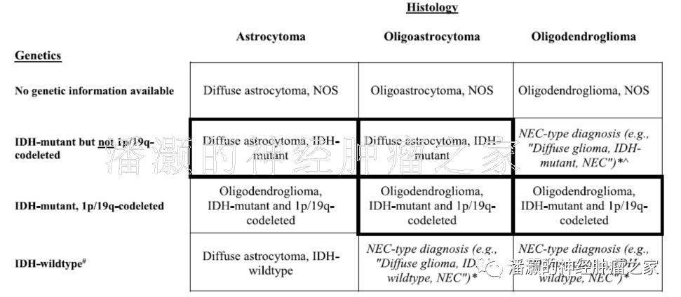 这种描述来看,NEC基本取代了原2016版指南中NOS的第三种适用情况,即得到相关检测的结果但是结果不符合现有诊断分类。用NEC取代NOS第三种情况,优势在于告诉临床医生,已进行了相关检测,而不是因各种原因没有进行相关分子检测。仍以少突胶质细胞瘤举例,少突胶质细胞瘤的诊断除了组织学病理之外,还应该具备IDH突变和1p19q共缺失这两个分子特征,但是如果仅有IDH突变或仅有1p19q共缺失,那么此时出具少突胶质细胞瘤诊断时,应后缀NEC。NEC的使用在病理报告中必须伴随详尽的组织、分子信息描述,并与临床医生进行详细沟通。同时相信,随着诊断分类的进一步细化,NEC这种情况应该会越来越少。对于临床医生来说,如果看到诊断报告中出现NOS或者NEC后缀,应积极与病理医生进行沟通,准确了解这两个后缀出现的原因及背景,在可能的情况下应积极联系进行相关补充实验,进一步明确病理诊断分型,方便后续的治疗方案制定。最后,简单说一下,NOS、NEC这两个诊断后缀,主要是给病理医生使用的,那么为什么我们还要关注。因为胶质瘤的诊断、治疗对我们神经外科医生来说,不仅仅是做好手术这个简单的要求了。神经肿瘤医生,可能是我们每一个关注胶质瘤领域的神经外科医生的成长目标。那么,我们就不仅仅需要做一个合格的神经外科医生,不能只知道什么肿瘤适合手术以及采用什么样的手术方式才能最大程度的安全切除肿瘤,还应该进一步熟悉肿瘤的诊断、肿瘤的放化疗,了解肿瘤的病理生理机制,了解最新的治疗进展如电场治疗、靶向治疗、免疫治疗等等。好吧,神经肿瘤医生,深坑慎入,一起努力慢慢爬坑吧!
