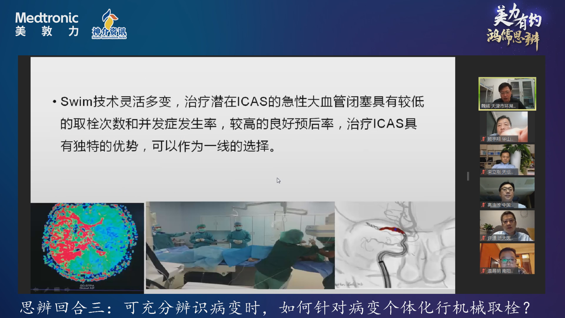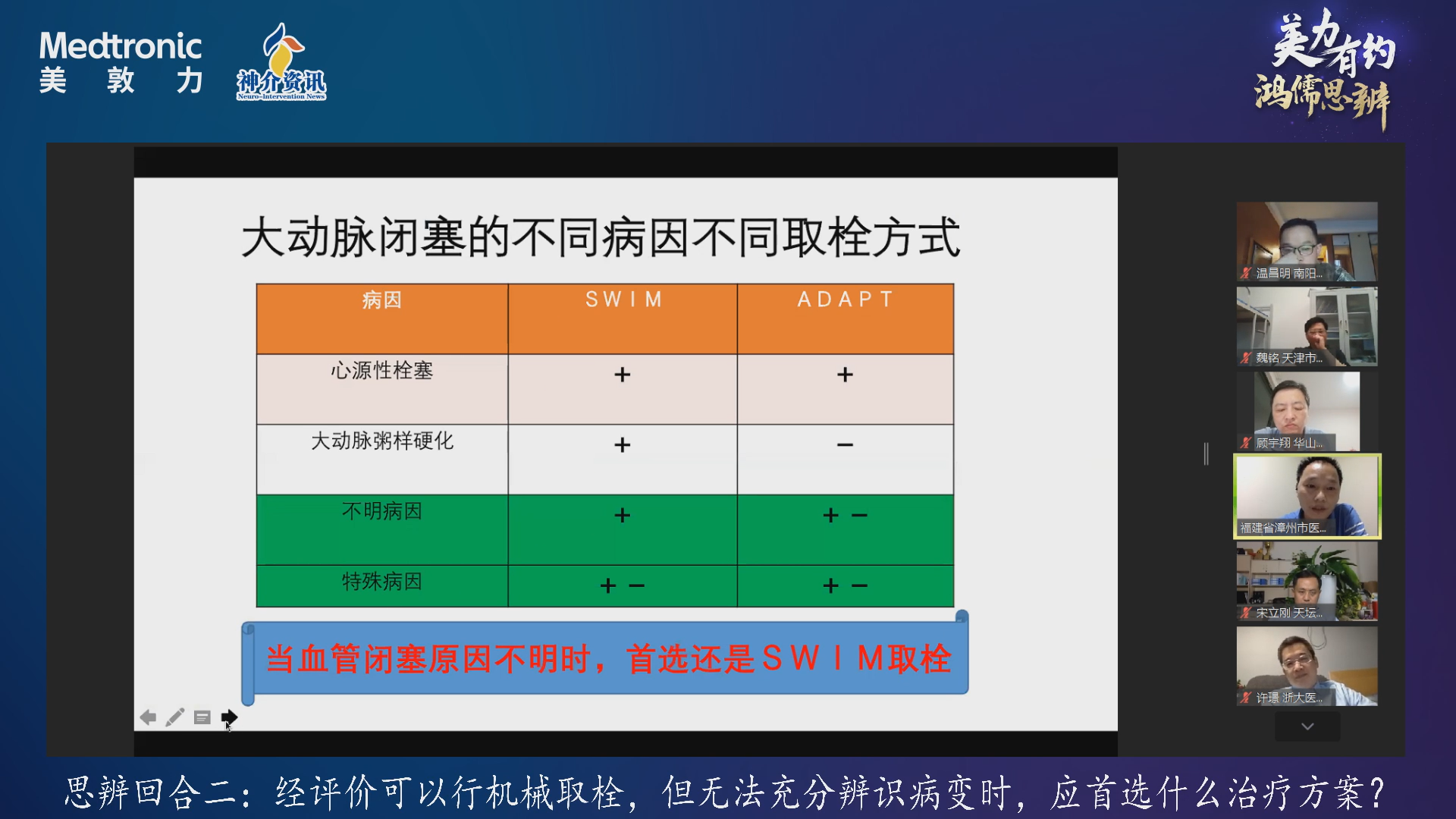 第二期鸿儒思辨的八位大家更进一步,针对大血管闭塞取栓策略行深入探讨,线上线下激情论辩,理越辩越明,行越走越正。机械取栓不仅局限于取栓,更是一个思辨诊断过程,明确诊断才能更好治疗,战之能胜就要狮子搏兔,效率最高的SWIM疗法最适合ICAS发病率高的中国人群。是故,一线支架取栓基石稳固,SWIM疗法普适中国。